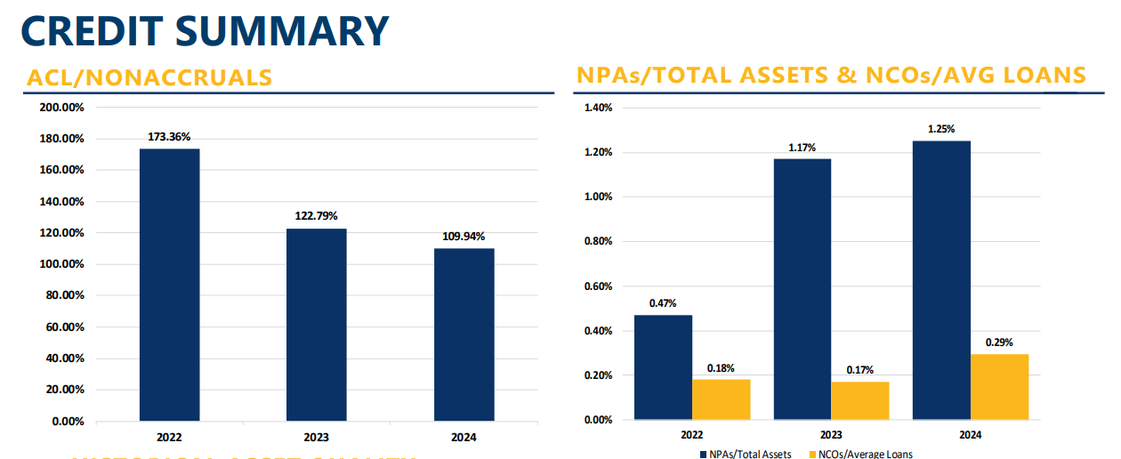 The focus of the financial institution’s loans (greater than 40%) is designated as “non-farm non-residential” which is code for business actual property. These loans are at present underneath scrutiny and will threaten the financial institution’s earnings in future quarters. The pattern is already starting to turn into regarding. The protection of the allowance for credit score losses towards non-accrual loans has fallen from 173% in 2022 to 110%. Non-performing property as a proportion of complete property are additionally rising. It additionally doesn’t assist that the financial institution’s allowance for credit score losses is underneath 1.2% of gross loans, which is 40 foundation factors under the business common.