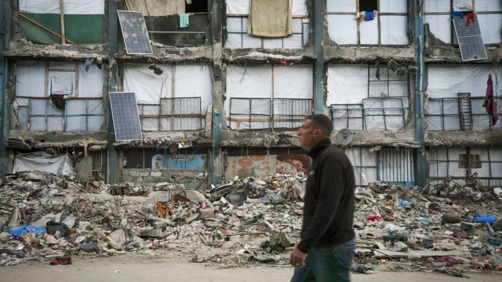 A person walks previous a home that continues to be partly standing, however with sheets serving as makeshift partitions and photo voltaic panels partly working, in an space largely destroyed by the Israeli military’s air and floor offensive in Gaza Metropolis on Wednesday.