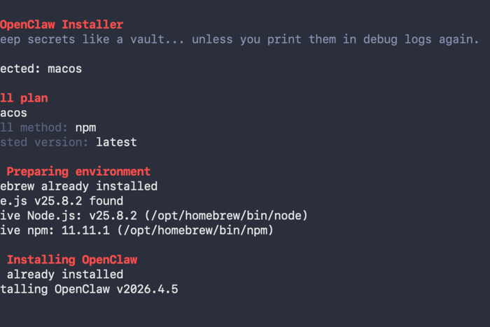 When you’ve rationalized your alternative right here, the installer guides you thru a collection of selections, permissions, and necessities that every, in their very own method, counsel to the novice tinkerer that it’s time to show round. Quickly, you’re “getting ready the surroundings” and discovering out that it’s essential to set up Node.js v25.8.2. Sounds nice. In Terminal messages and system notifications, you’re requested for consent and credentials, and also you continuously present them.