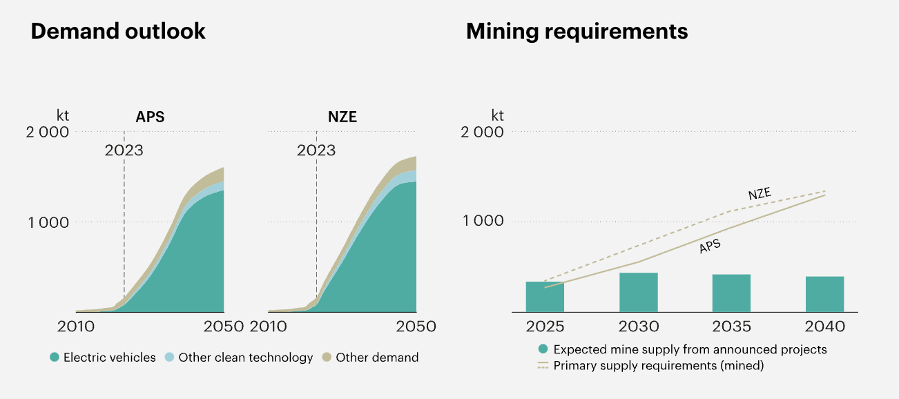 Evaluation of introduced tasks signifies that lithium uncooked materials provide grows to 450 kt Li round 2030 within the base case, once more greater than doubling the present manufacturing, and reaching 5 instances the manufacturing of 2020. Within the excessive manufacturing case, an extra 70 kt Li of uncooked materials provide could possibly be made out there available on the market. If introduced tasks come on-line as deliberate, this quantity approaches the necessities within the STEPS in addition to within the APS in 2030, however is inadequate to remain on the 1.5 °C pathway. Past 2030, all situations require an additional funding in new provides to maintain tempo with the demand progress.