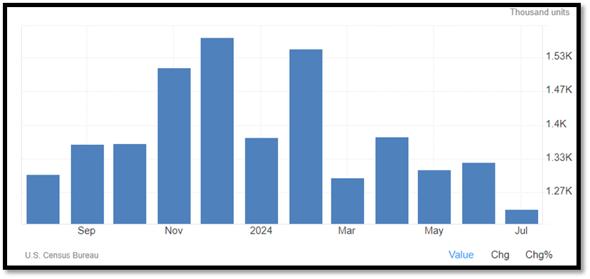In July 2024, housing begins within the US decreased 6.8% to an annualised fee of 1.238 million. For comparability, June 2024 reported a 1.1% enhance, and this additionally represents the most important drop since March to the bottom stage since 2020. The lower was as a result of a 14.1% fall in constructing begins with one unit.