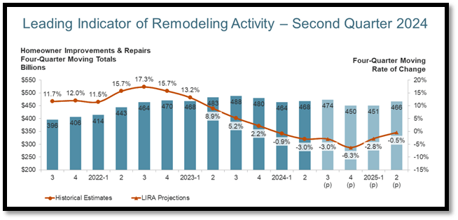 Earlier than the anticipated uptick in 2025, the LIRA forecasts that remodelling exercise will stay weak in 2024. Particularly, a year-over-year decline of three% is projected for 3Q24, with 4Q24 anticipated to be the weakest at -6.3%. After this era, the slowdown in house remodelling is anticipated to be comparatively gentle, with spending ranges stabilising near earlier years.