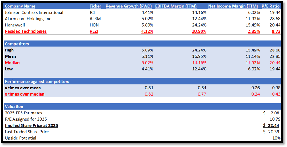 Earlier than we start, a fast recap on REZI. It specialises within the growth and manufacturing of technology-driven merchandise and options that present water and vitality administration, consolation, security, and safety. In my relative valuation mannequin, I’ll evaluate REZI towards its friends by way of progress outlook and profitability margins TTM. For progress outlook, I can be evaluating their ahead income progress fee, which is taken into account to be a forward-looking metric. For revenue margins, I can be evaluating their EBITDA margin TTM and web earnings margin TTM.