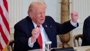 U.S. President Donald Trump gestures as he speaks throughout a "Nice, Historic Funding in Rural Well being Roundtable" within the...