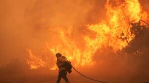 A firefighter battles the Canyon Fireplace in August in Hasley Canyon, Calif. As temperatures rise with human-caused local weather change,...