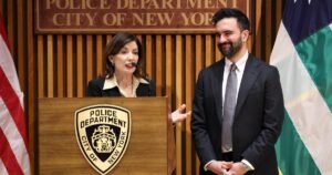 New York governor Kathy Hochul and Mayor Zohran Mamdani converse at a public-safety announcement at NYPD headquarters. Photograph: Charly Triballeau/AFP/Getty...
