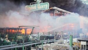Firefighters attempt to put out a hearth after two guided bombs hit the Epicenter buying complicated in Kharkiv, Ukraine, on...