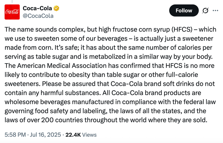And inside hours, Coca-Cola was sharing an announcement defending its use of corn syrup after Fox Information framed the alleged change to cane sugar as a win for the “MAHA” motion in an X publish. (Well being and Human Companies Secretary Robert F. Kennedy Jr. has known as high-fructose corn syrup “only a method for making you overweight and diabetic,” sparking rumors that he would possibly ban or prohibit it from sure meals.)