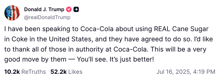 So in a second of desperation, Trump turned to the one factor that’s at all times there for him: Coke. He introduced in a Fact Social publish on Wednesday afternoon that Coca-Cola shall be switching to “REAL Cane Sugar in Coke in america,” all due to him: